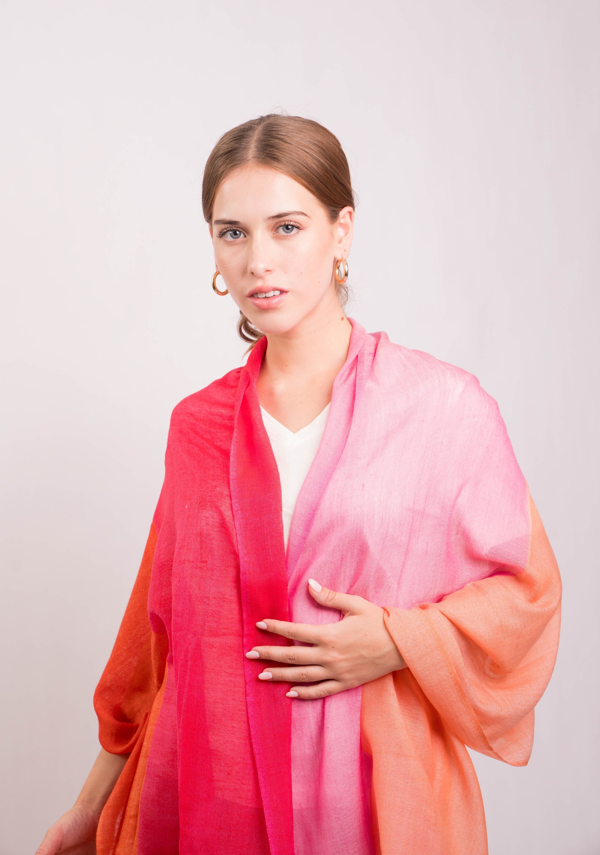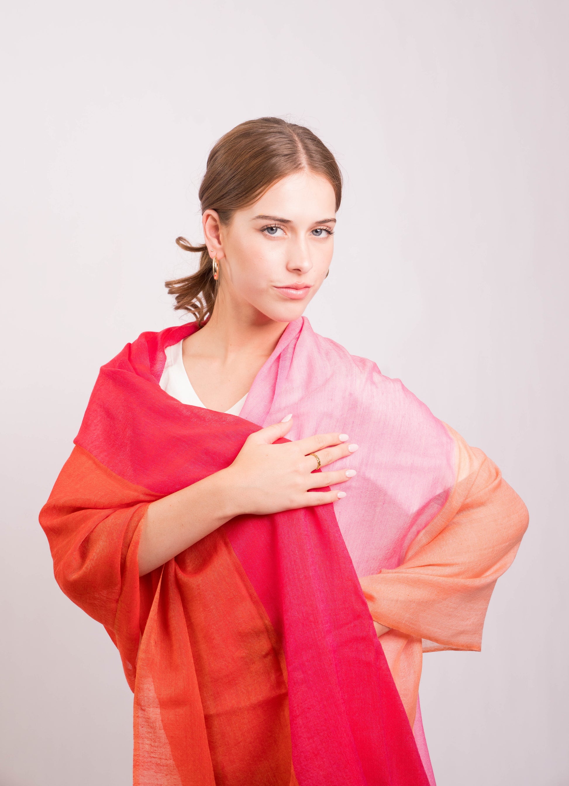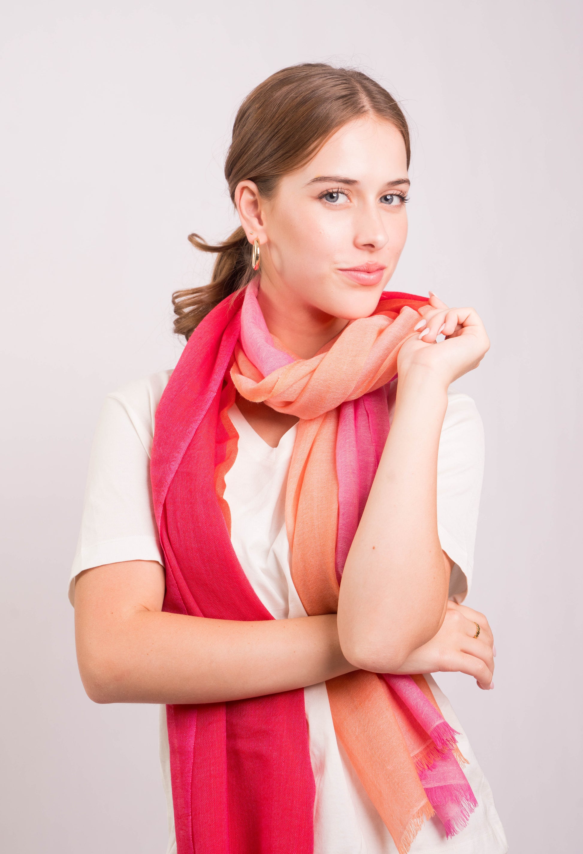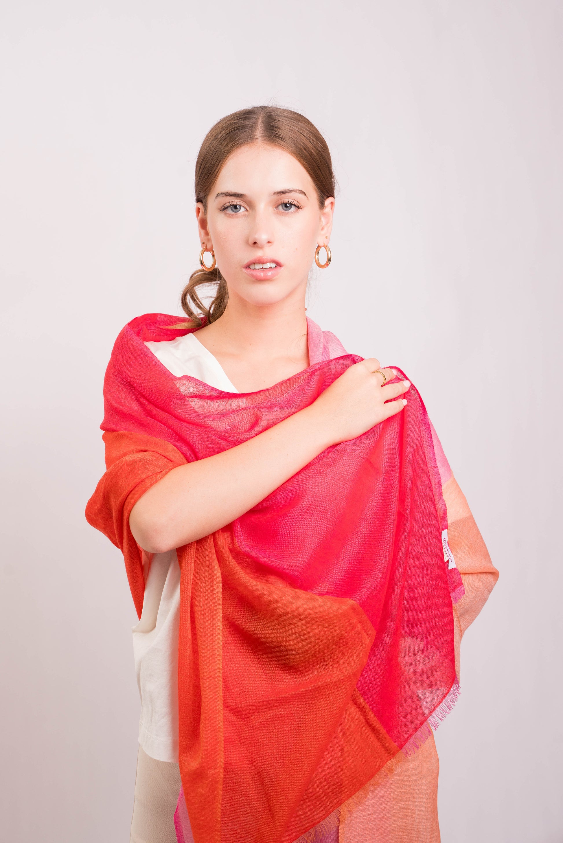 This lightweight 4 Block wool scarf is great for adding a pop of color to an outfit without adding bulk, making it perfect for transitional seasons or layering. This scarf has 4 shades of beautiful pink and orange shade making it perfect for anyone who wants a color in their wardrobe.