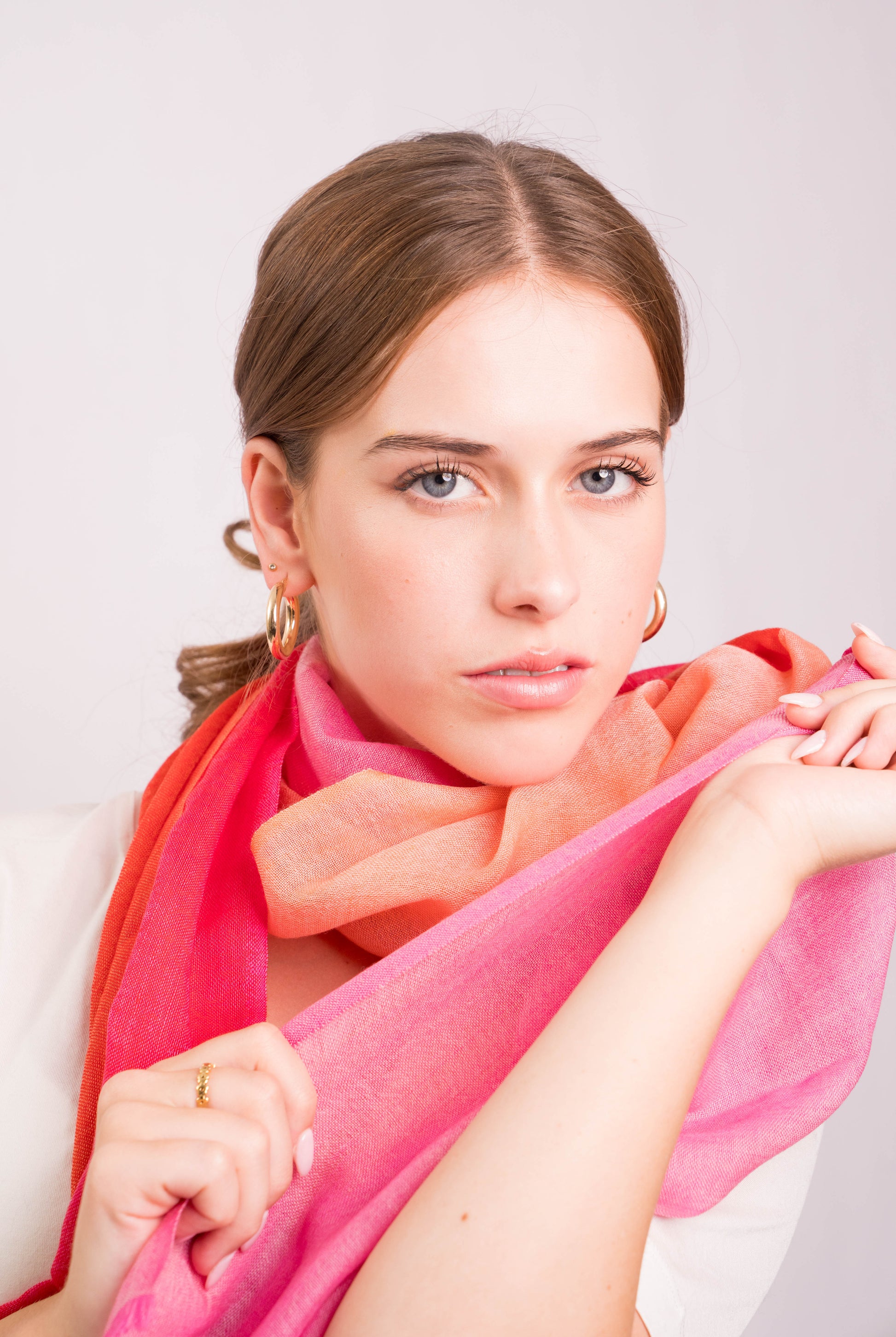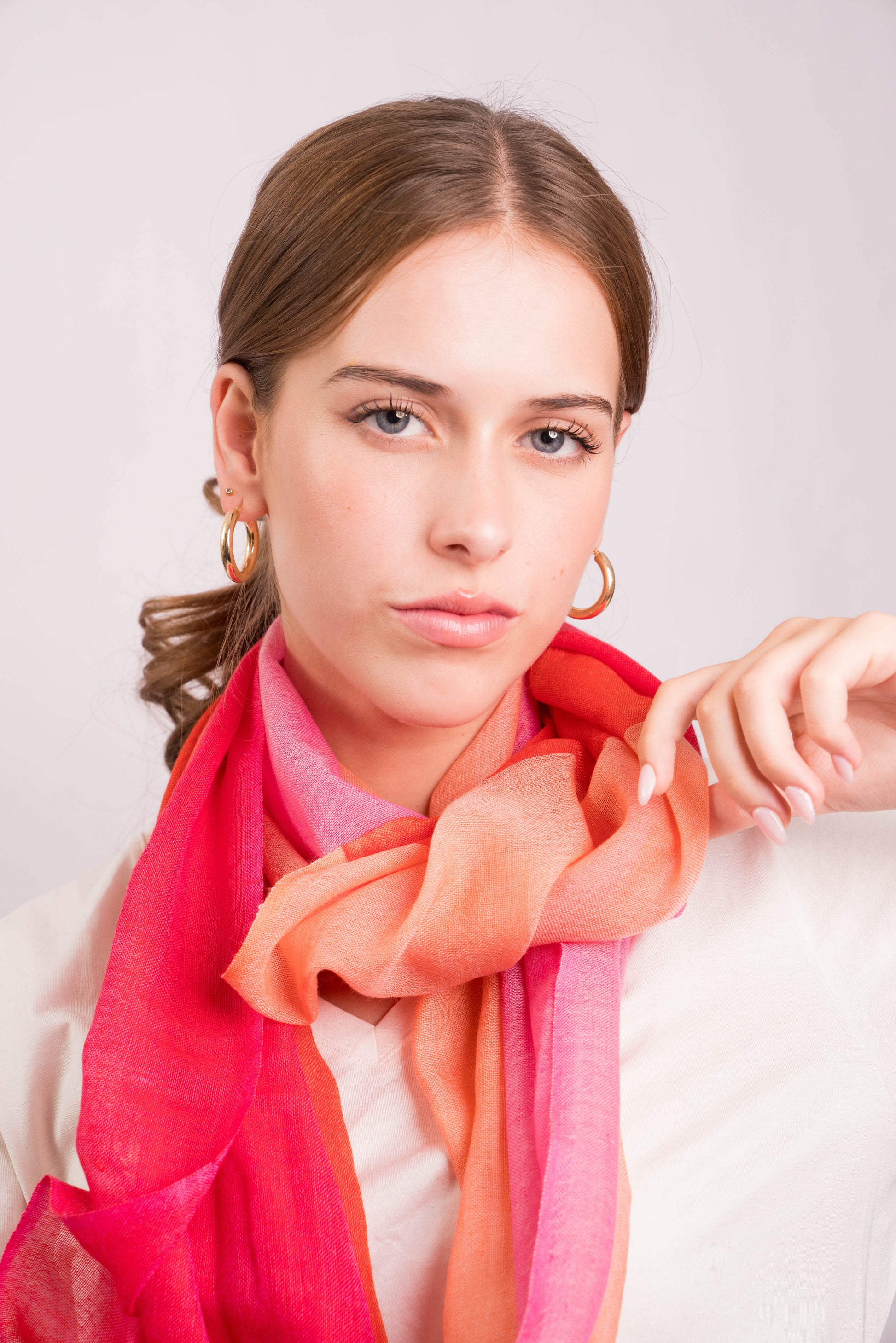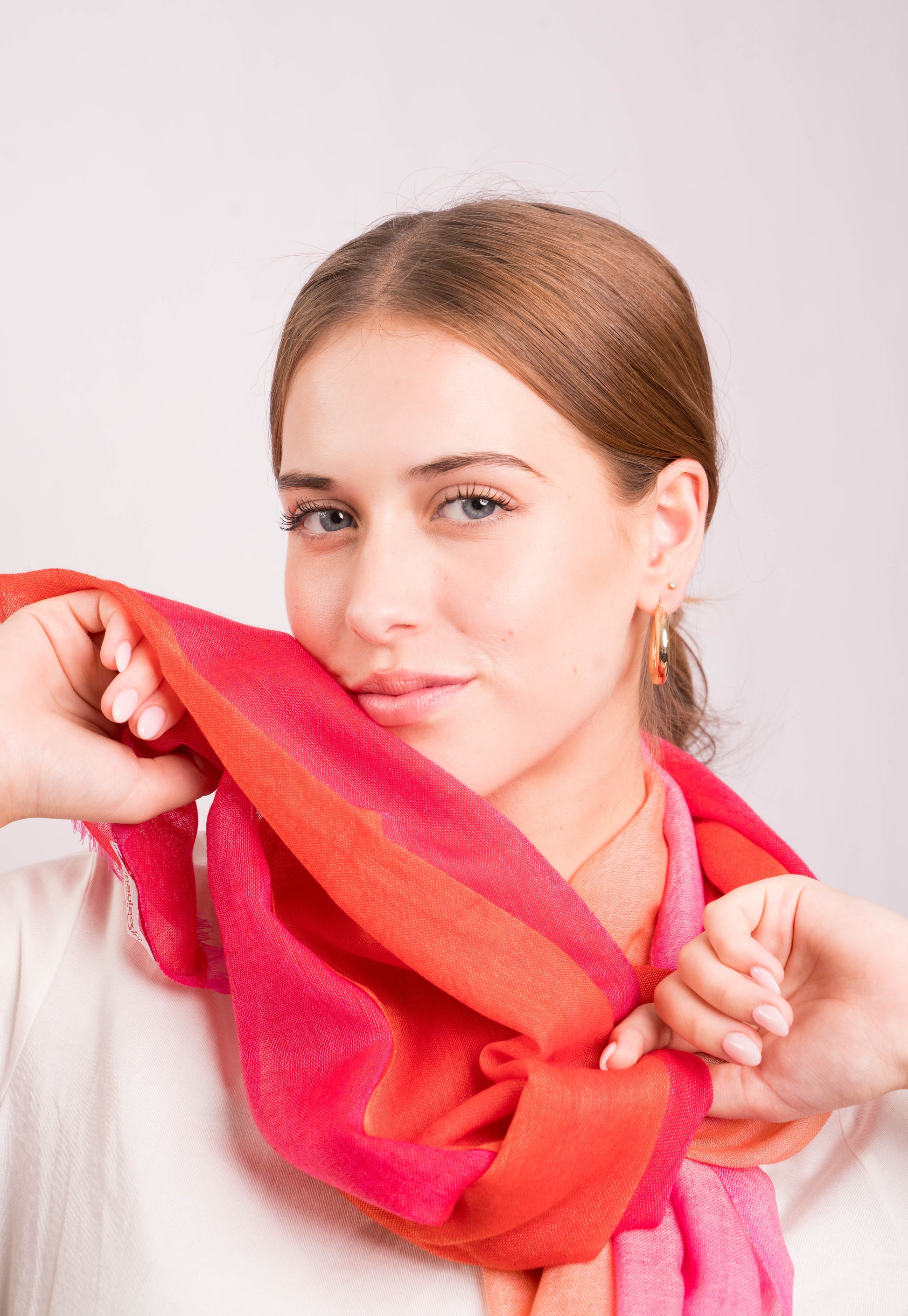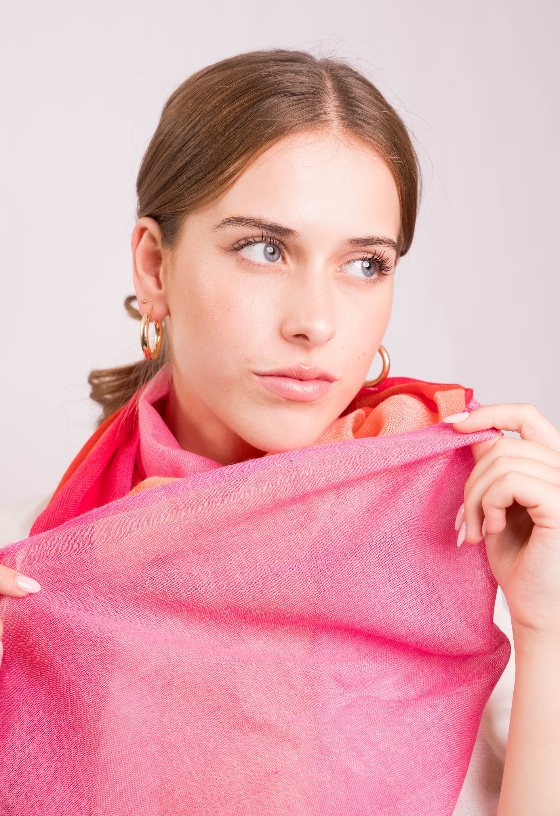 This lightweight 4 Block wool scarf is great for adding a pop of color to an outfit without adding bulk, making it perfect for transitional seasons or layering. This scarf has 4 shades of beautiful pink and orange shade making it perfect for anyone who wants a color in their wardrobe.