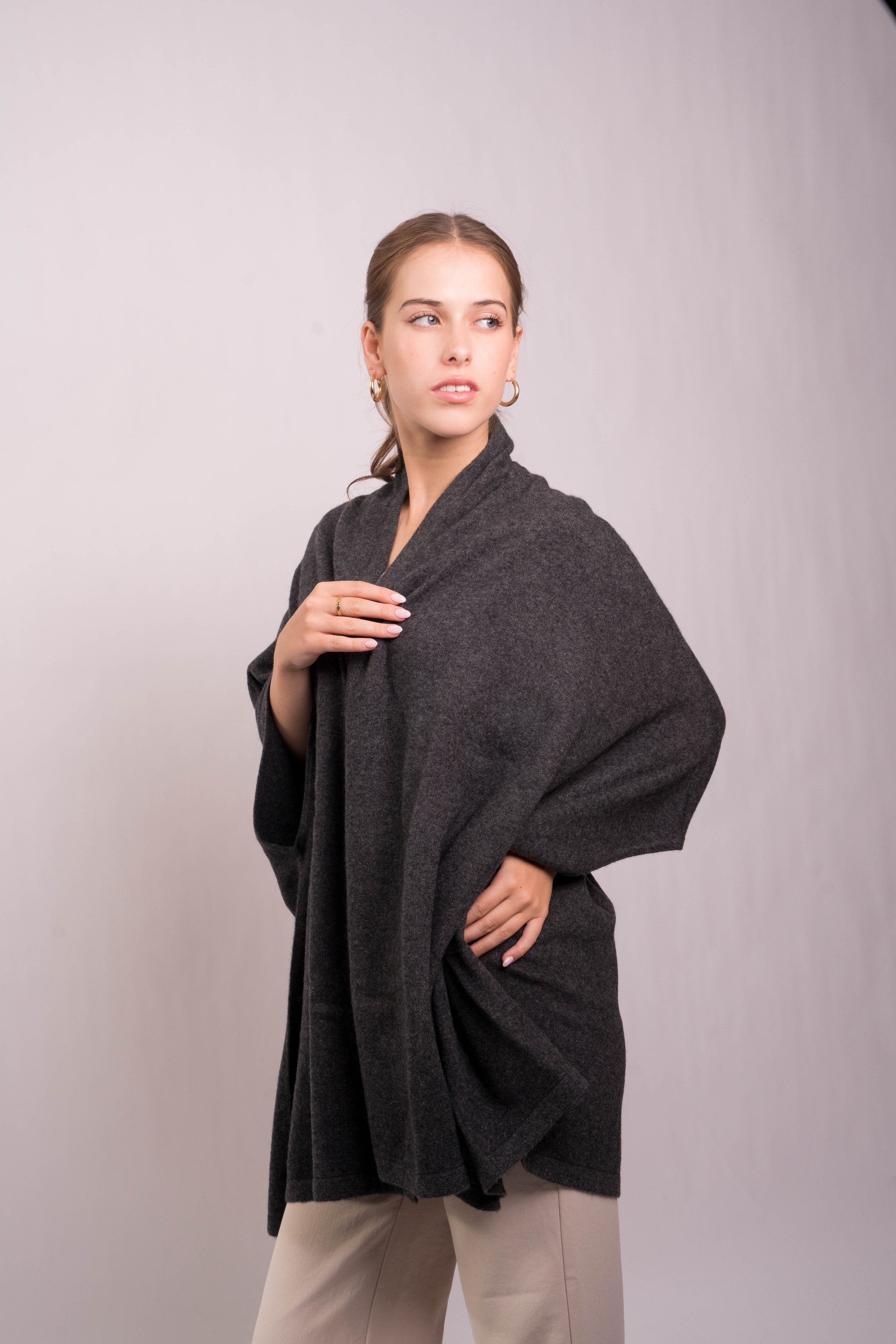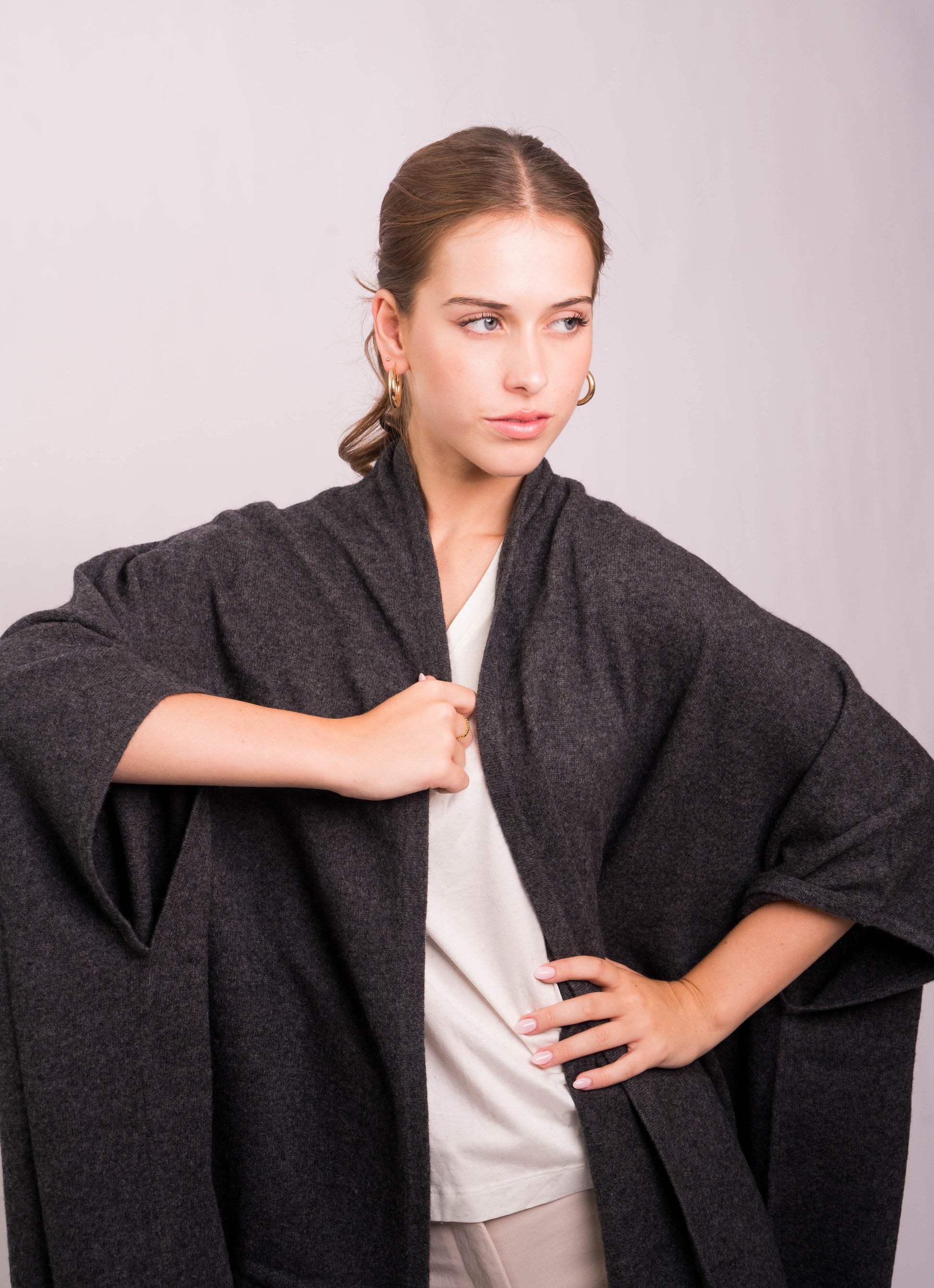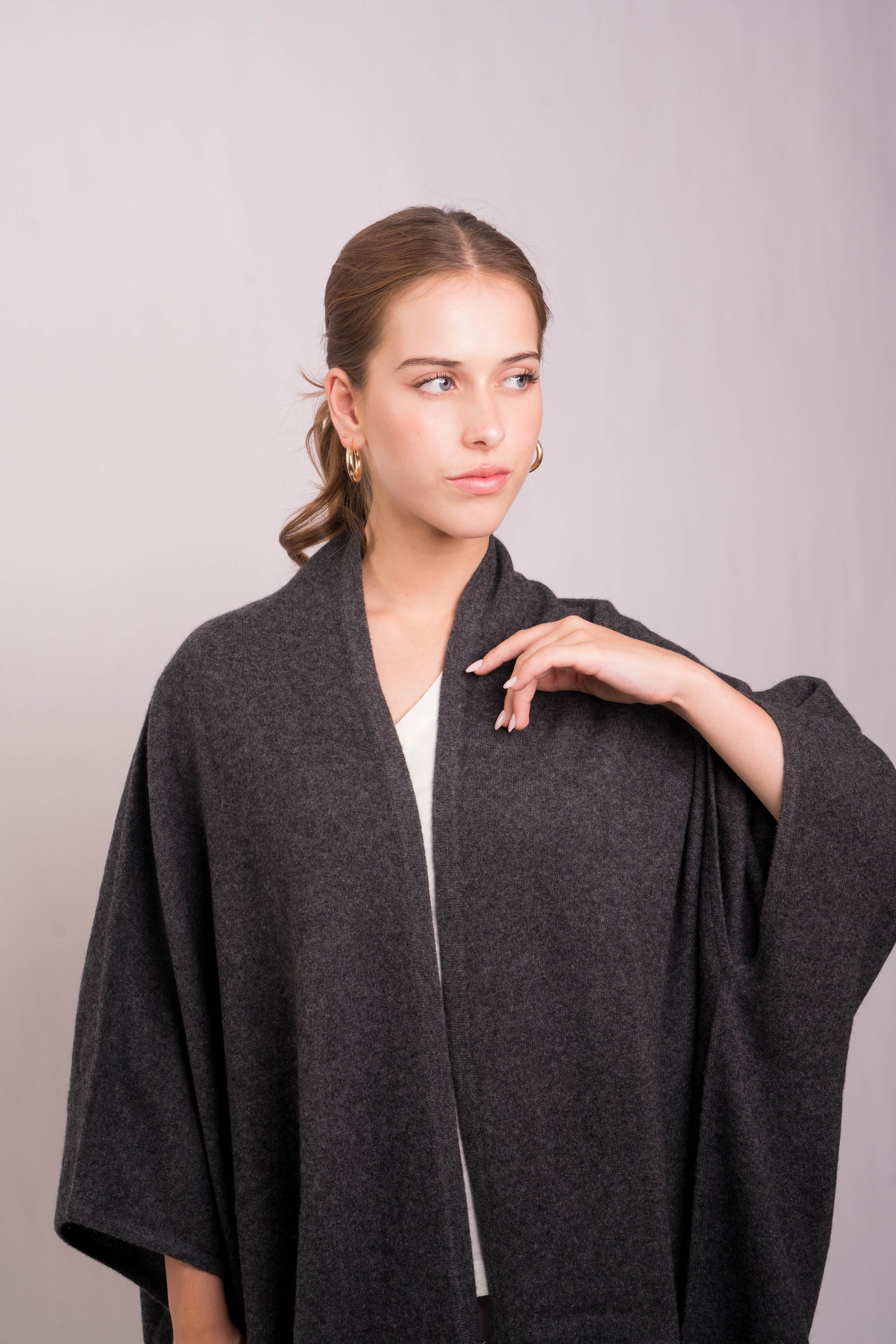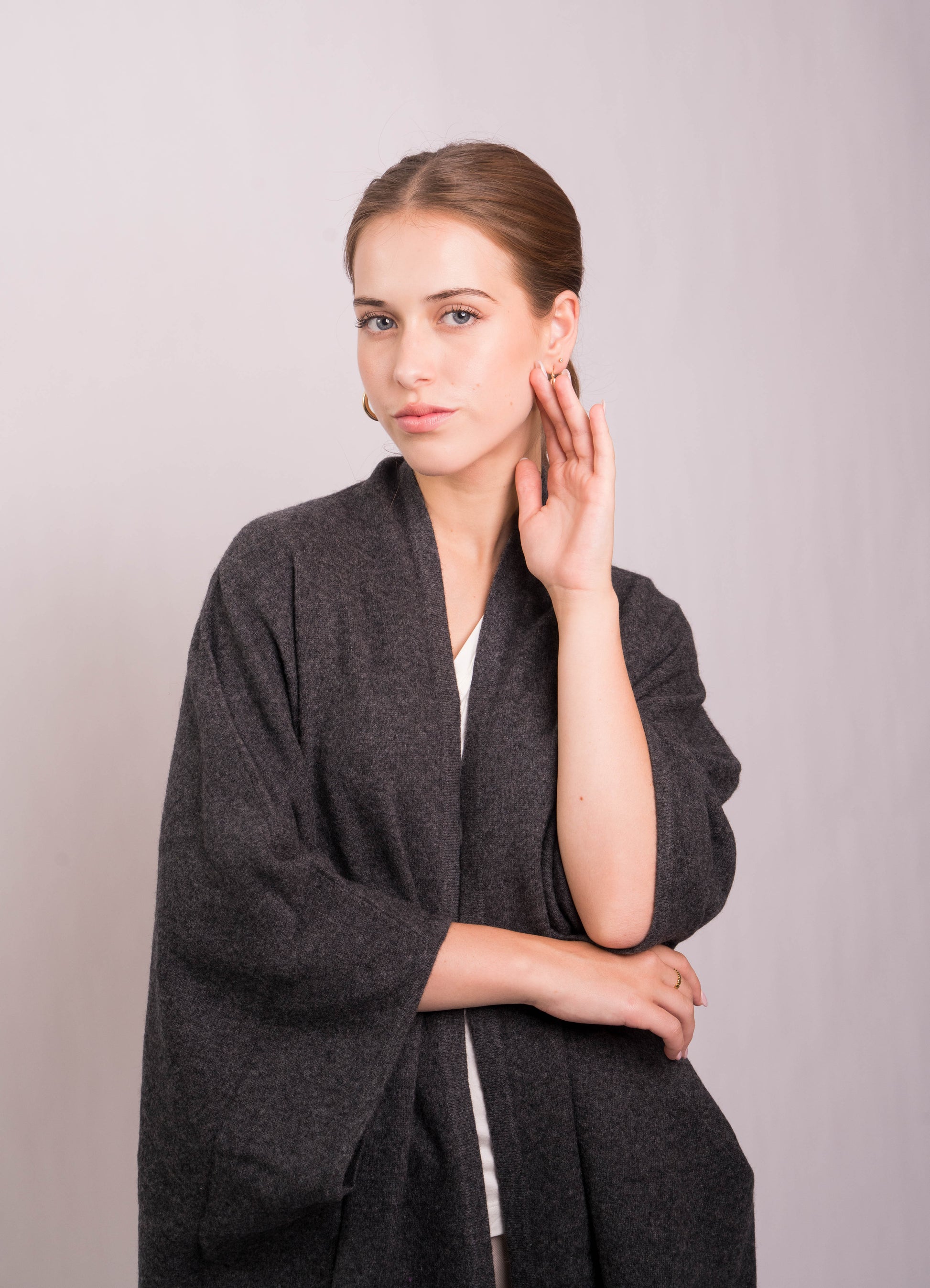 Embrace effortless elegance with the Graphite Luxe Kimono, crafted from 100% pure cashmere for an unparalleled blend of softness, warmth, and breathability. Designed to drape beautifully, this versatile layering piece exudes timeless sophistication, making it a staple for both casual and refined styling.