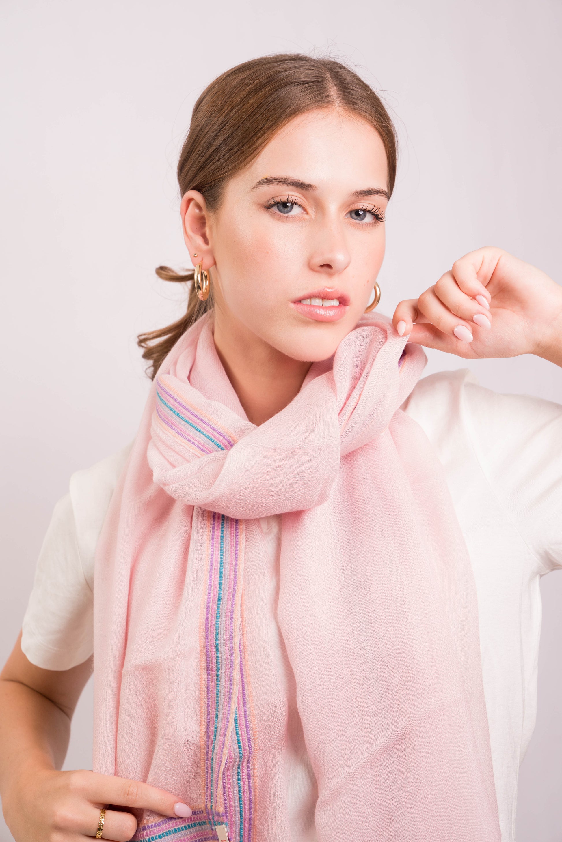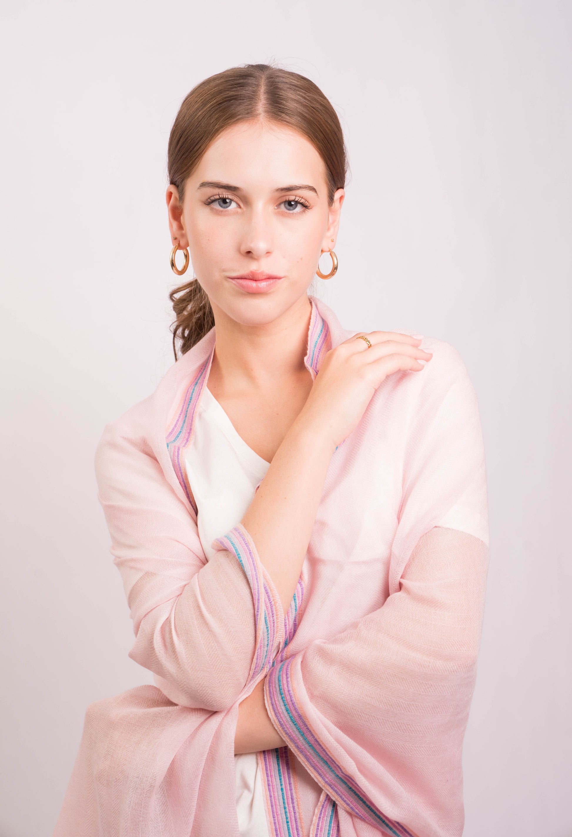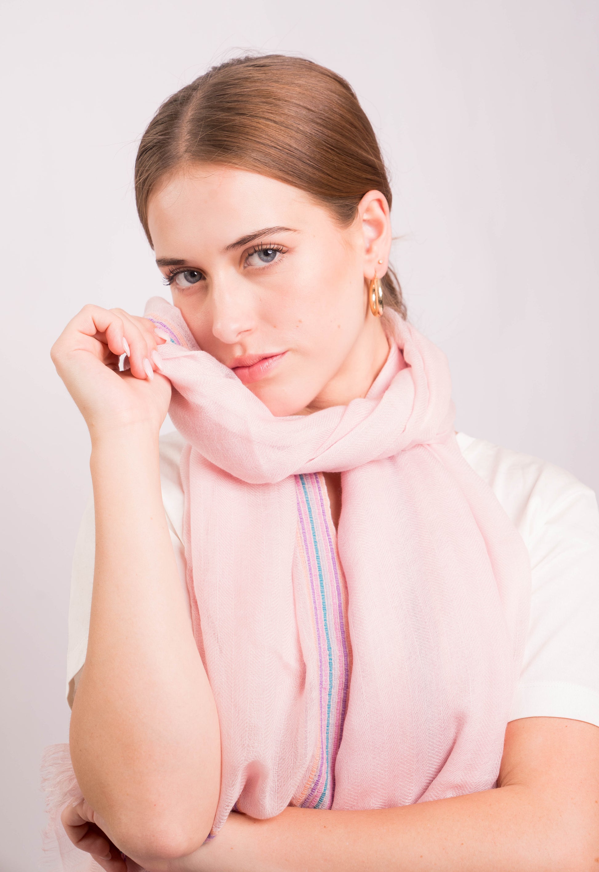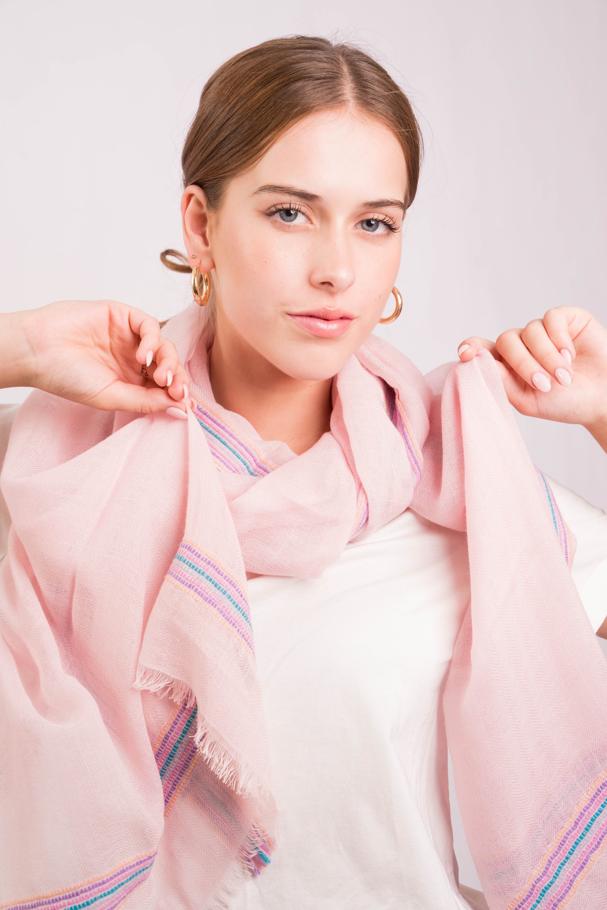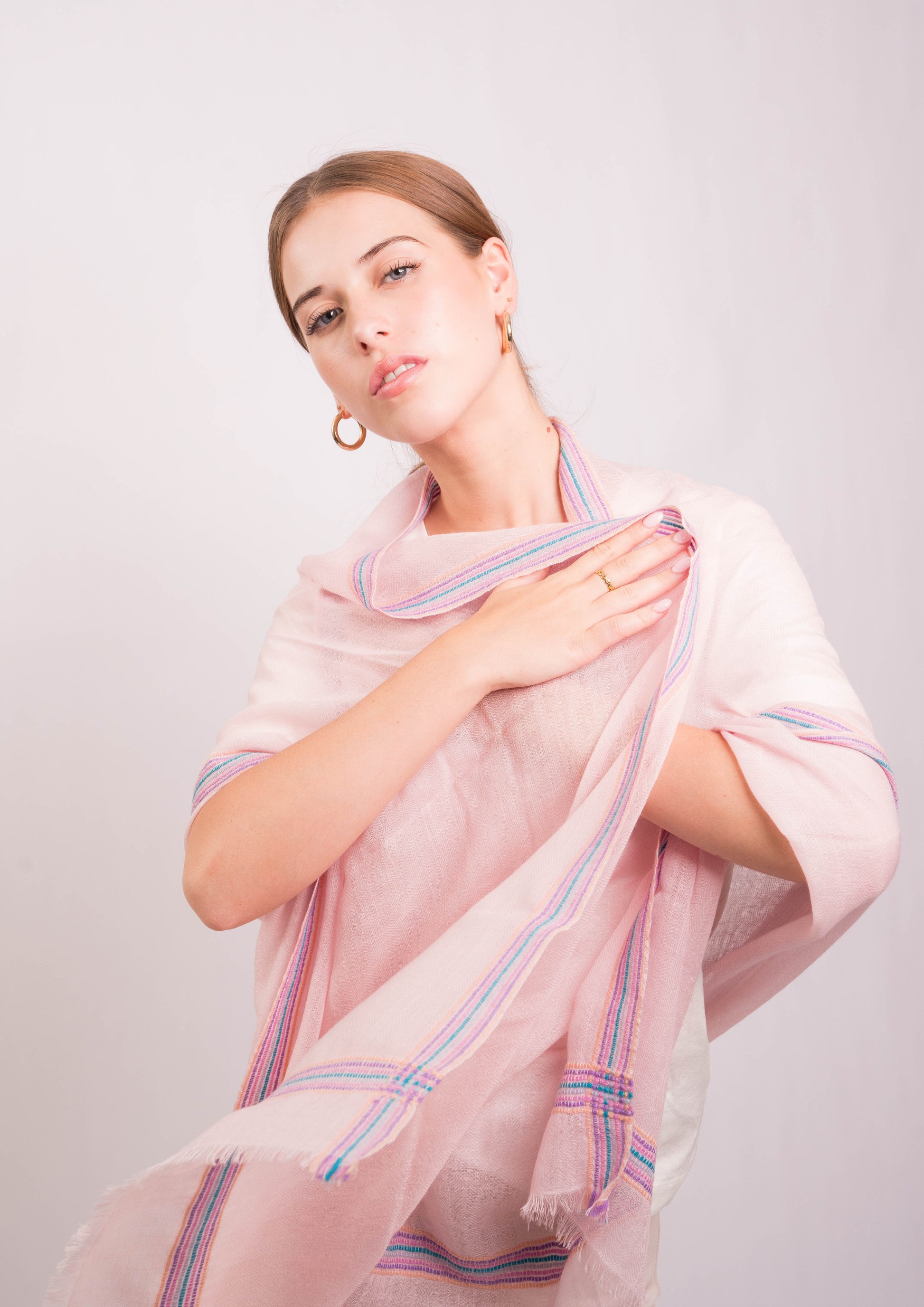 Perfect for layering over casual or formal ensembles, this wrap offers unparalleled softness and breathability. Whether draped over the shoulders for a relaxed look or styled as a scarf, the Gypsy Border Blush Scarf is your go-to accessory for effortless elegance.